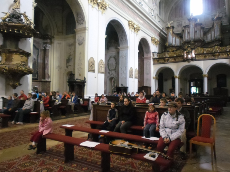 Tak jsme s písní na rtech dojeli do cíle. V Šaštíně jsme hned zamířili k bazilice Panny Marie sedmibolestné (nejvíc lidí se však hrnulo na faru na záchod :-) ). V deset hodin začala česká mše, kterou odsloužil otec Josef Daněk. Po krátkém výkladu od místního kostelníka o historii baziliky se všichni (nebo skoro všichni) posadili na lavičky před kostelem a poobědvali z vlastních zásob. Poté jsme šli do oratoře, kde na nás čekalo několik slovenských spolupracovníků.