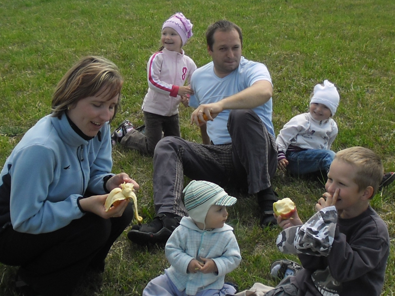 Děti nejvíce zaujaly prolézačky, trampolína, pískoviště a hříště. Dospělí se mezitím pohodlně usadili a popíjeli kafíčko s buchtičkami. Když jsem se šla podívat k veliké trampolíně, na kterou děti stály frontu. Tak jsem zahlédla papír a na něm v překladu stálo: „Vstupné na trampolínu je modlitba zdrávas Maria. Za rodinu (jméno rodiny jsem si už nezapamatovala), která darovala trampolínu Slovenským salesiánům.“ Tak jsme se všichni dobře bavili. A to i já, protože jsme na pískovišti udělali překrásné bábovičky. A když už jsme se chystali k odchodu, ještě jsme se vyfotili s pozadím kostela a jeli jsme dál.