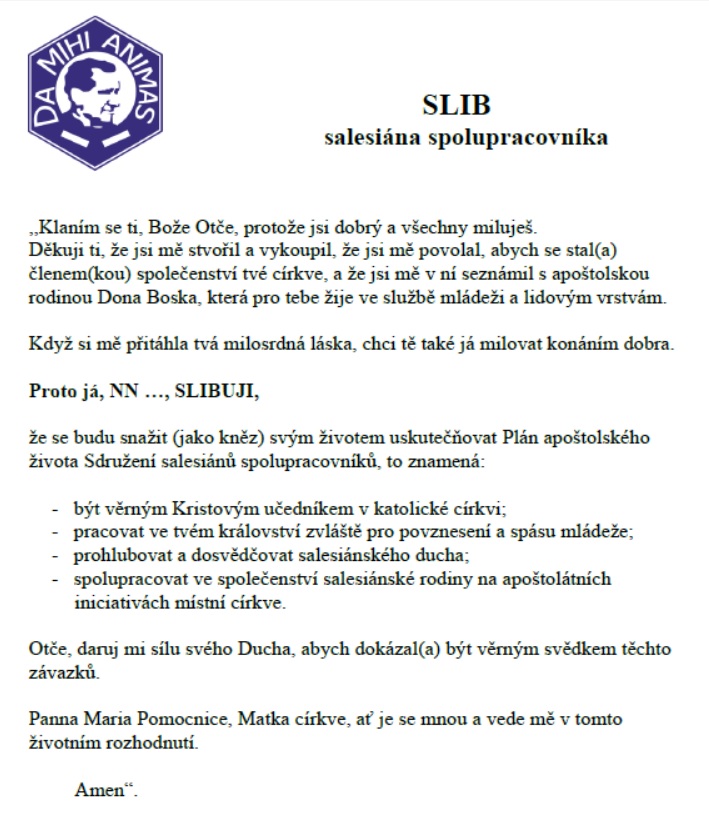Děkuji ti, že jsi mě stvořil a vykoupil, že jsi mě povolal, abych se stal(a) členem(kou) společenství tvé církve, a že jsi mě v ní seznámil s apoštolskou rodinou Dona Boska, která pro tebe žije ve službě mládeži a lidovým vrstvám.