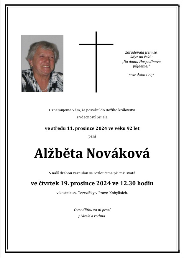 Přikládám na naše stránky parte paní Alžběty Novákové, sestry VDB. Pokud si pamatuji, nikdo jí neřekl jinak než Zuzka. Možná je řada důvodů, proč o ní nevíme, tak mi dovolte ji připomenout. Osobně jsem ji poznal v roce 1969, to když se přestěhovala z různých pražských podnájmů do Čimické, kde začali s Jendou Vývodou ze všech sil znovuoživovat kobyliskou farnost, tehdy ještě s agentem P. Sedlákem, který tam bydlel, i salesiánského Ducha.