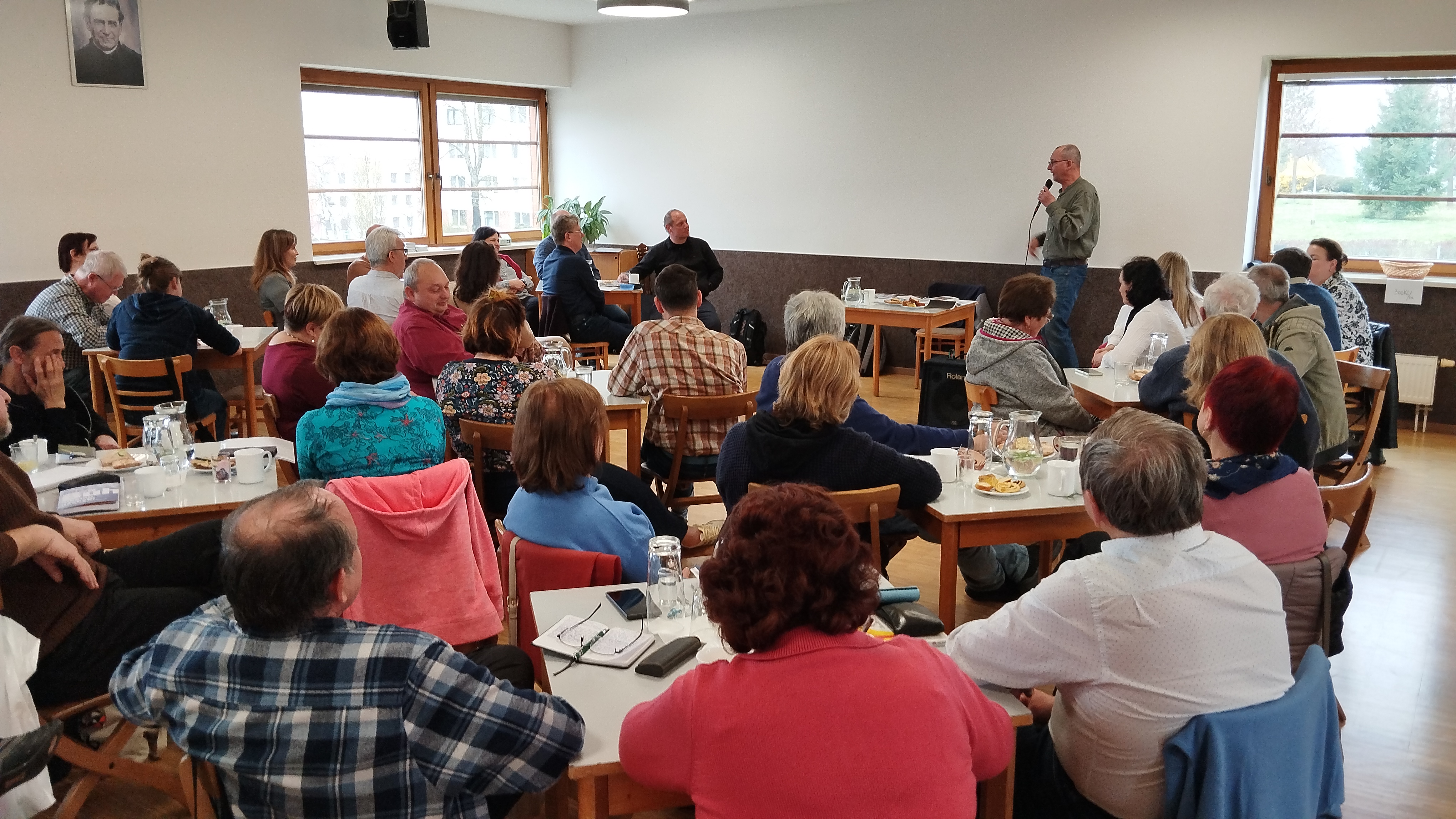 Po bouřlivém vzájemném přivítání (často se vídáme jednou nebo dvakrát do roka) jsme zahájili duchovní obnovu písní (Apoštolskou) a ranními chválami. Poté se ujal slova Zdeněk a květnatě hovořil na téma „Zajeté koleje“ – Prosíme tě, obrať nás! Přednáška by se také mohla nazvat „Co s naším mládím a co s naším stářím“ a „Liturgie Bílé soboty“.