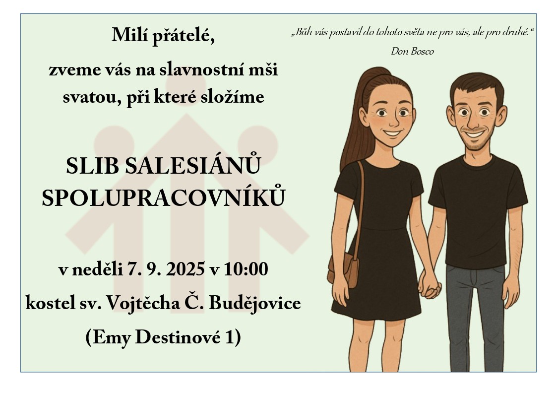 ADRESA: Sdružení salesiánů spolupracovníků Kobyliské náměstí 1 182 00 Praha 8 IČ: 00406902 číslo účtu: 253474458 / 0300 Články podle data | 07.10.2025: 150. let od založení Sdružení salesiánů spolupracovníků