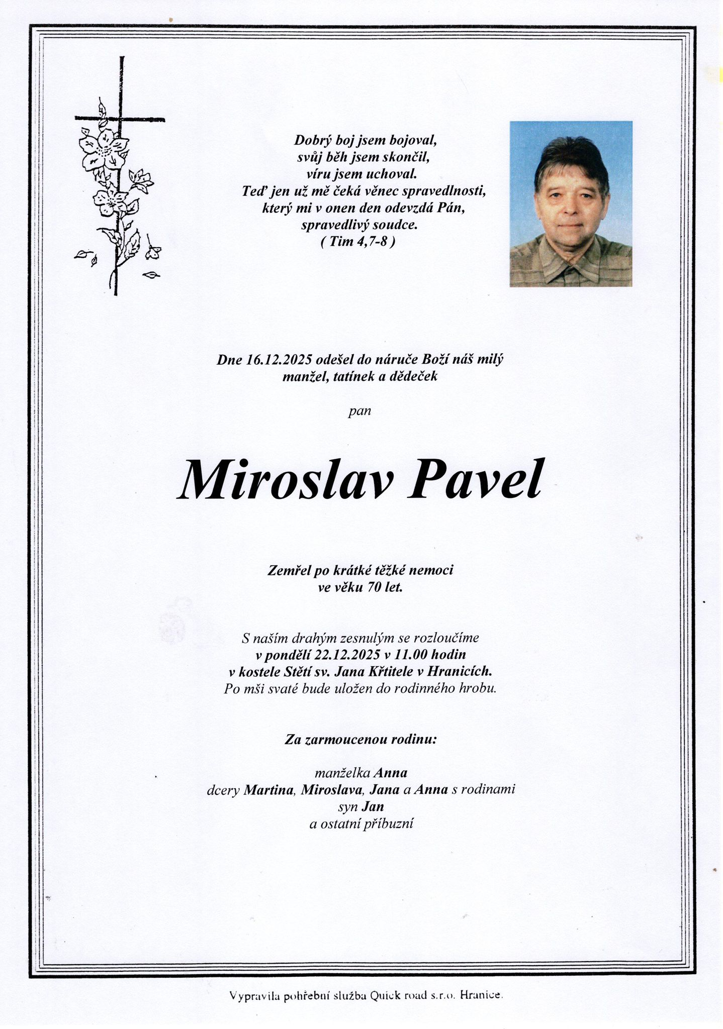 V úterý 16. prosince odešel do Boží náruče Miroslav Pavel z Hranic z našeho společenství Moravská Brána. Dobrý člověk! Laskavý, obětavý, vždy ochotný druhému pomoci.